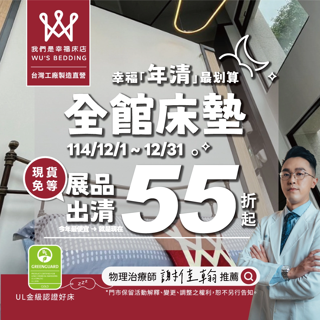 床墊優惠比雙11更猛!最低55折!國內床墊產品唯一通過UL金級認證-我們是幸福床店 2025年終 床墊展品出清活動,12/1–12/31全國16家門市限量開跑。展示床架+枕頭+冬被同步特賣。品況佳,單一品售完不補。(