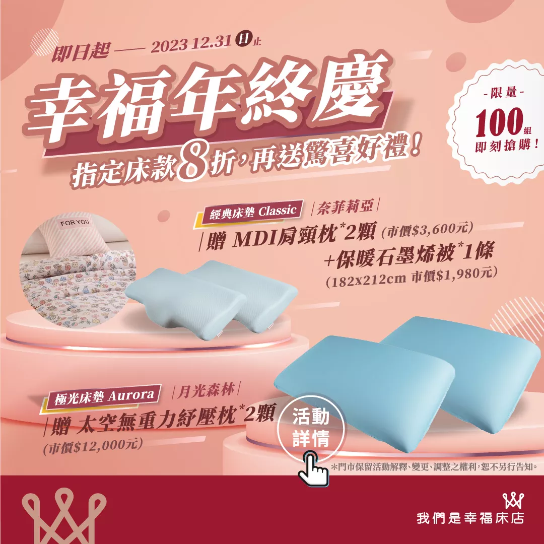 2023幸福年終慶~指定床款8折,再送驚喜好禮!經典床墊奈菲莉亞,贈 MDI肩頸枕*2顆(市價$3,600元) +保暖石墨烯被*1條(182x212cm 市價$1,980元),贈品總價值:5580元。極光床墊月光森林贈 太空無重力紓壓枕*2顆(市價$12,000元) ,還有醫生推薦枕頭與獨家獨立筒電動床同步優惠。(詳情)